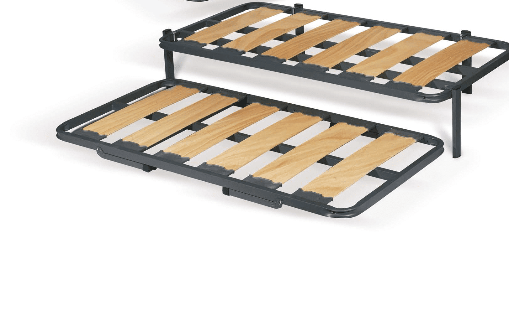 El somier inferior también incorpora tubo de 40 x 30 mm y una barra central de refuerzo, con tacos de caucho silenciosos. Somier inferior con patas desplegables y ruedas.