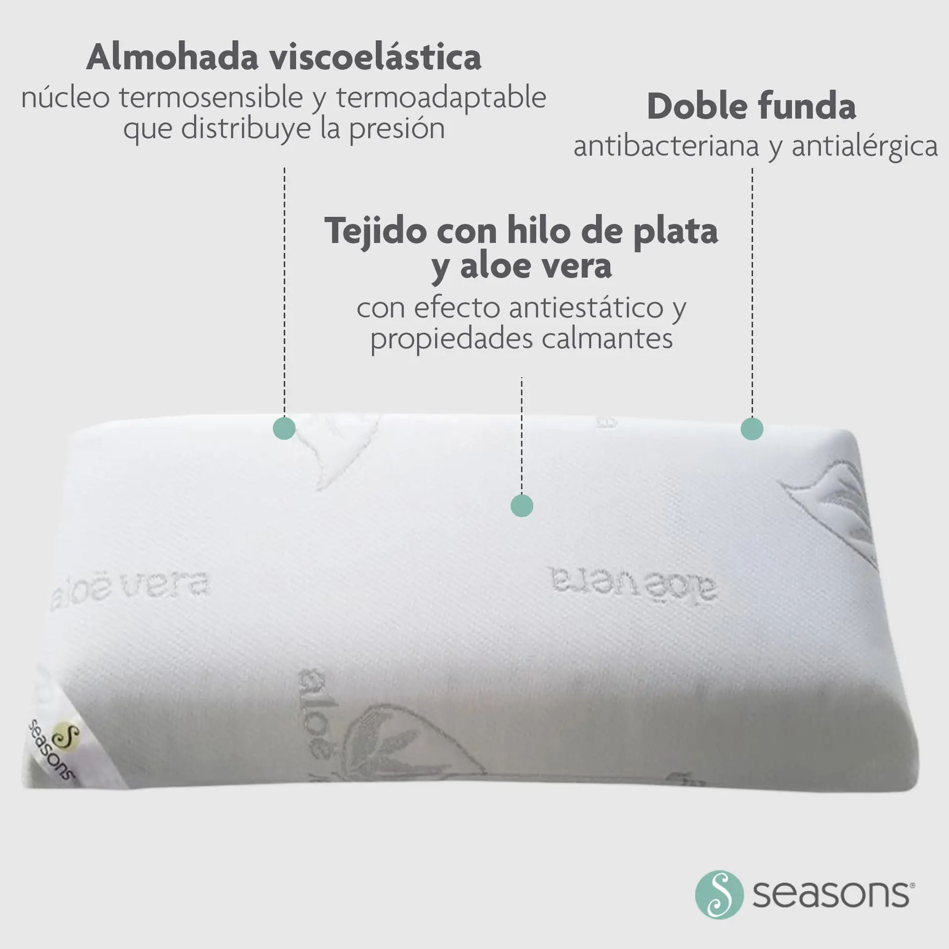 - Incorpora doble funda: Funda exterior desenfundable con cremallera y tejido con propiedades terapéuticas Aloe Vera stretch con hilo lurex color plata y funda interior en tejido de punto.
